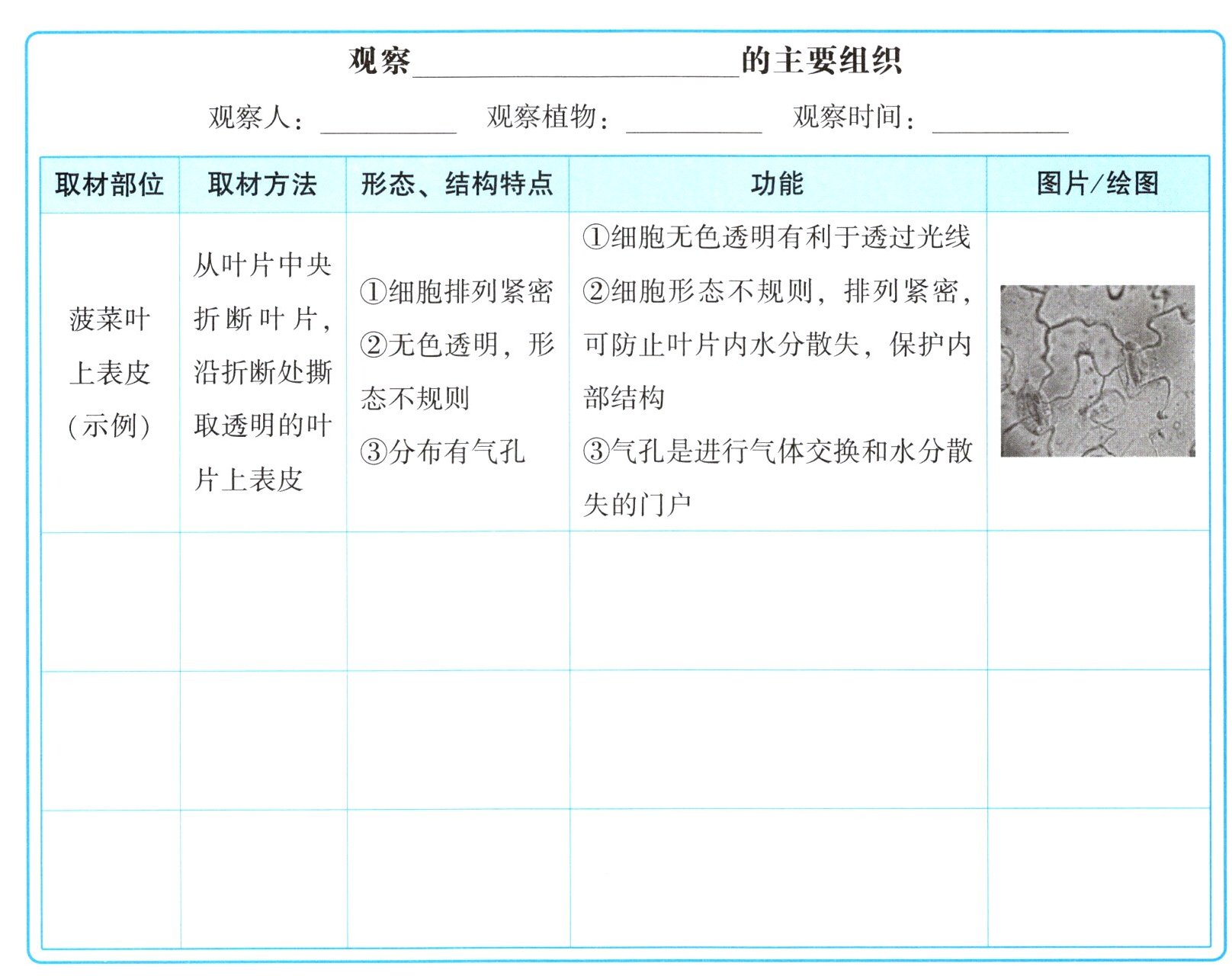 请同学们自选要观察的植物材料,以小组为单位分工观察、比较植物体主要组织的结构特点,参照示例做好相关记录,并分析结构与功能的关系。