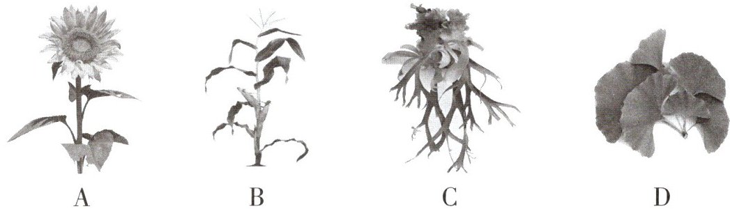7. 下图分别为向日葵、玉米、鹿角蕨、银杏四种植物的图片,请回答下列问题。