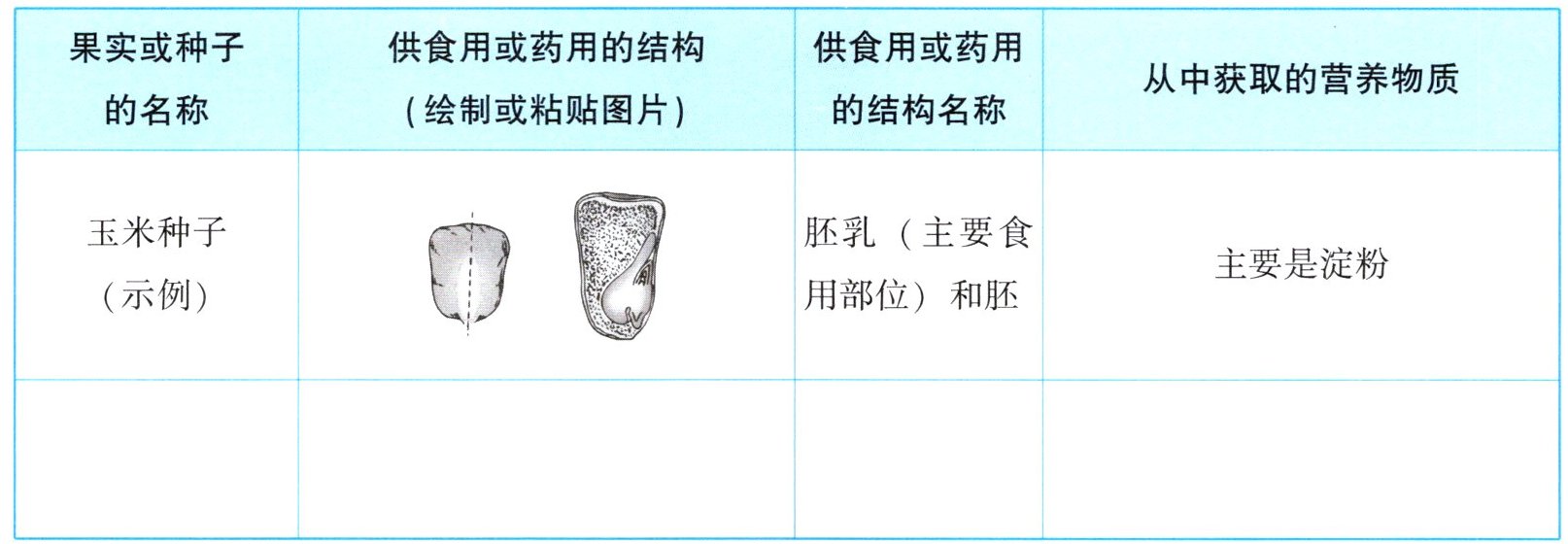 |果实或种子的名称|供食用或药用的结构(绘制或粘贴图片)|供食用或药用的结构名称|从中获取的营养物质|
