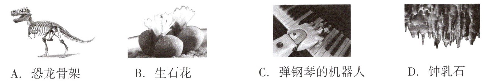 【解析】:生物具有以下特征:生活需要营养,能进行呼吸,能排出身体内产生的废物,能对外界刺激作出反应,能生长和繁殖,都有遗传和变异的特性,除病毒以外,都是由细胞构成的。生石花能进行呼吸、能生长和繁殖等,属于生物;恐龙骨架是化石,不具有生物的特征,不属于生物;弹钢琴的机器人、钟乳石都不具有生物的特征,不属于生物。