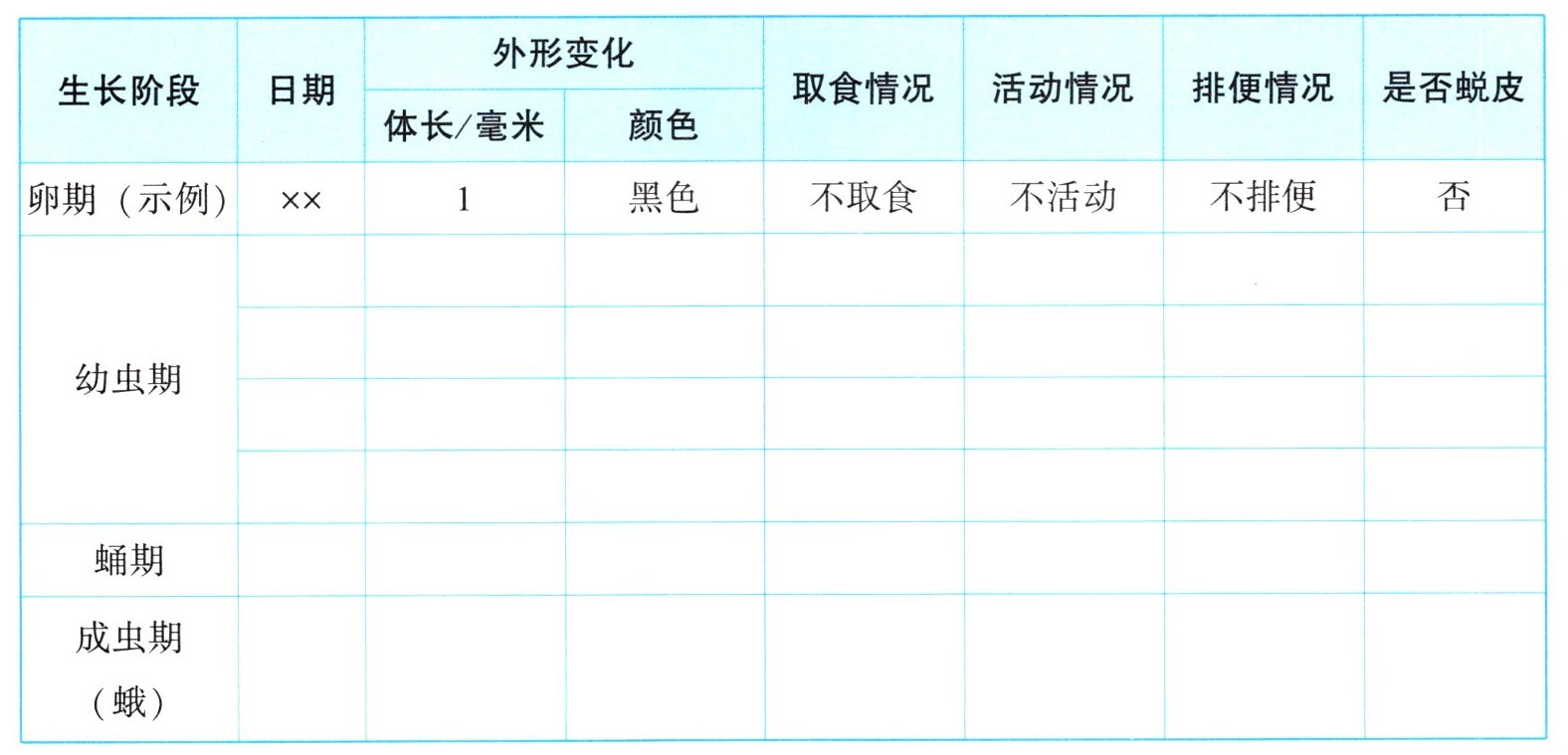 |生长阶段|日期|外形变化|取食情况|活动情况|排便情况|是否蜕皮|