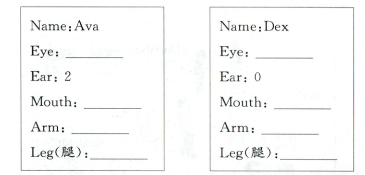 任务一:第一条横线填B,第二条横线填A 任务二:Ava卡片,从上到下,4 1 2 5 Dex卡片,从上到下,1 1 4 2 任务三:发挥想象,画出一只小怪兽。(答案不唯一,合理即可。)