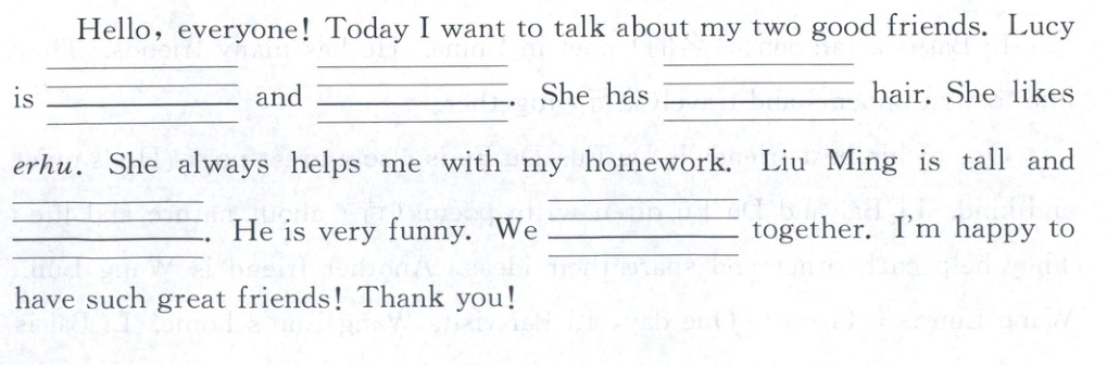 五 Li Dong参加了“我和我的朋友们”演讲展示活动,但是他的演讲稿被水打湿了。快来听一听他想说些什么?帮他把演讲稿补充完整吧!(5★)