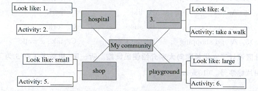 任务三:I have a pretty community. There are lots of flowers and trees. There is a big shop. We can go shopping there. There is a large gym,too. I often do sports with my friends. My favourite place in my community is the park. I often take a walk with my family after dinner. I really like my nice community!