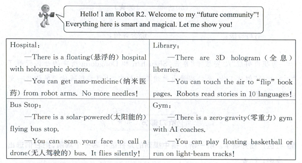 九 社区的科技角中,有一段机器人Robot R2对未来社区进行的描述。看一看,读一读,尝试完成任务吧!