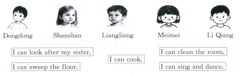 Dongdong 带领朋友们参加“我是家庭小能手”活动。听一听,他们都能干些什么吧!将图片与活动连一连吧!(5★)