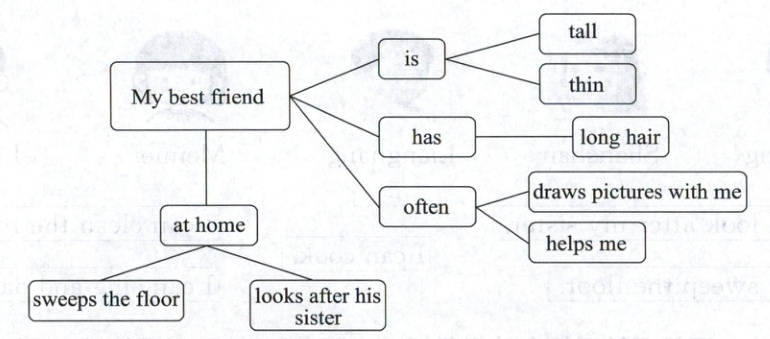 My best friend I have a best friend. His name is Jack. He is thin and has long hair. He often draws pictures with me and helps me a lot. At home, he sweeps the floor and looks after his sister. He is a really nice friend, and I like playing with him.
