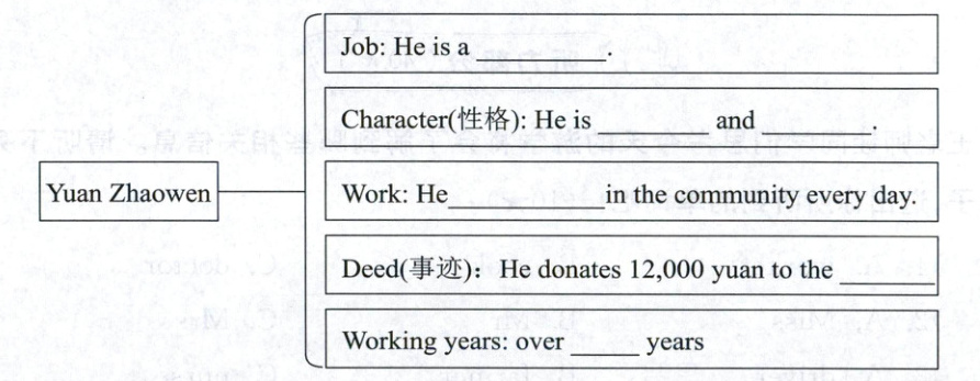 He works hard. Everyday he cleans the streets in the community very clearly(干净的). And he likes to help people. He donates(捐赠) all his 12,000 yuan to the hospital in Wuhan to help sick people. He says, “Helping people makes me happy.” People call him “Good Grandpa Yuan” in China.