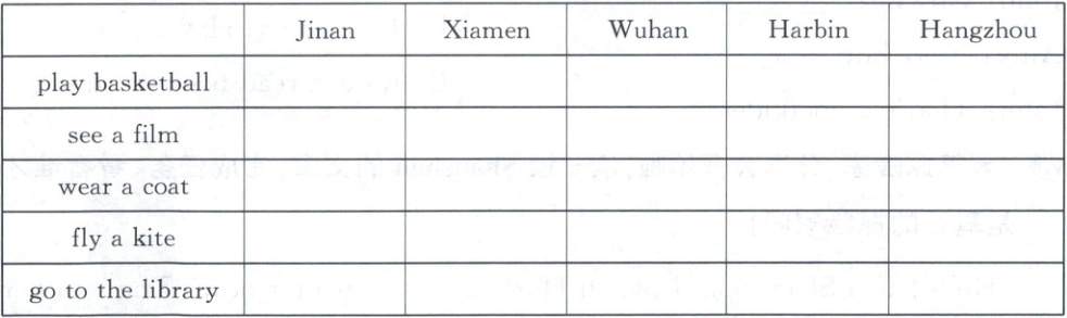 JinanXiamenWuhanHarbinHangzhou play basketball √ see a film √ wear a coat √ fly a kite √ go to the library √