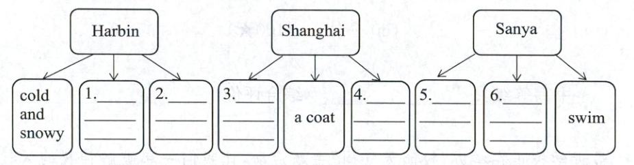 Hello! I’m Shanshan. I live in Harbin. It’s in winter now. The weather is cold and snowy. I wear a thick coat, sweater, and gloves. My friend Kate and I make a big snowman. We can have a snowball fight. In Shanghai, my cousin Mark says it’s cool and rainy. He wears a coat and makes cards with his friends. My uncle is in Sanya. It’s hot and sunny there. He wears a T-shirt. He can swim. How different the weather is!