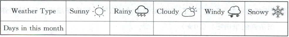 My City’s Weather Observer | Weather Type | Sunny | Rainy | Cloudy | Windy | Snowy | | Days in this month | 12 | | | | | There are twelve sunny days in this month. Sunny days are the most common. I like sunny days because I can play basketball with my friends in the park. I feel happy when it is sunny.