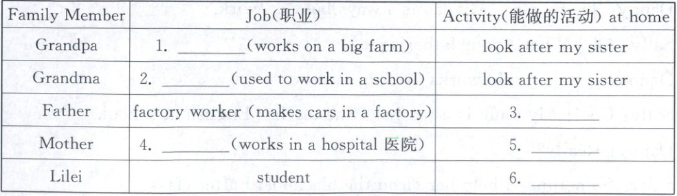 Dongdong邀请Lilei在“最美家庭分享站”中分享他的家庭。大家听一听Lilei的介绍,根据录音内容补全信息吧!(6★)