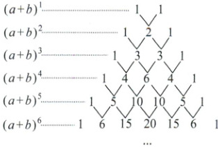 $\begin{aligned}&1\\&a + b……………………1\ 1\\&(a + b)^2…………………1\ 2\ 1\\&(a + b)^3………………1\ 3\ 3\ 1\\&(a + b)^4……………1\ 4\ 6\ 4\ 1\\&(a + b)^5…………1\ 5\ 10\ 10\ 5\ 1\\&(a + b)^6………1\ 6\ 15\ 20\ 15\ 6\ 1\\&(a + b)^7……1\ 7\ 21\ 35\ 35\ 21\ 7\ 1\\&(a + b)^8…1\ 8\ 28\ 56\ 70\ 56\ 28\ 8\ 1\end{aligned} $
