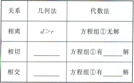 (1) 条件:直线 $ l:Ax + By + C = 0(A,B $ 不全为 $ 0) $ 与圆 $ C:(x - a)^2 + (y - b)^2 = r^2 $,圆心 $ C(a,b) $ 到直线 $ l $ 的距离 $ d = \frac{|Aa + Bb + C|}{\sqrt{A^2 + B^2}}(A,B $ 不全为 $ 0) $,方程组 $ \begin{cases} Ax + By + C = 0, \\ (x - a)^2 + (y - b)^2 = r^2. \end{cases} $ ①