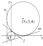 当切线为l时,因为kOO₁ = 4/3,所以kl = -3/4,设方程为y = -3/4x + t(t > 0),O到l的距离d = |t|/√(1 + 9/16) = 1,解得t = 5/4,所以切线的方程为y = -3/4x + 5/4.当切线为m时,设直线方程为kx + y + p = 0,其中p > 0,k < 0,由题意{ |p|/√(1 + k²) = 1,|3k + 4 + p|/√(1 + k²) = 4,解得{k = -7/24,p = 25/24,所以切线的方程为-7x + 24y + 25 = 0.当切线为n时,易知切线方程为x = -1.