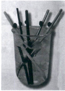实验材料:塑料、木头、铜、铝、钢 5 种材料棒,凡士林,珠子,烧杯,热水。