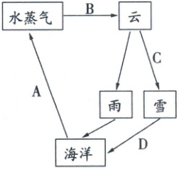 水的三种形态的变化,构成了自然界中的水循环。请根据下图所示,用下列六个词语填空:蒸发、凝华、液化、融化、凝固、升华。