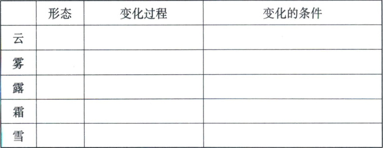 | 雾 | 小水滴 | 水蒸气遇冷液化 | 近地面温度降低,空气中水蒸气含量大 |