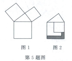 5. 勾股定理是人类最伟大的科学发现之一,在我国古算书《周髀算经》中早有记载。如图 1,以直角三角形的各边为边分别向外作正方形,再把较小的两张正方形纸片按图 2 的方式放置在最大的正方形内。若知道图中阴影部分的面积,则一定能求出(