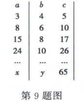 9. 如果正整数 $ a $,$ b $,$ c $ 满足等式 $ a^2 + b^2 = c^2 $,那么正整数 $ a $,$ b $,$ c $ 叫作勾股数。某同学整理了自己探究勾股数的过程(如图),观察图中每列数的规律,可知 $ x + y $ 的值为(