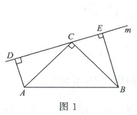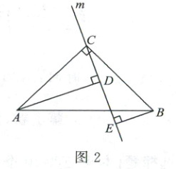 (2)如图2,当点A,B在直线m的异侧时,请问(1)中线段DE,AD,BE之间的数量关系还成立吗?若成立,请说明理由;若不成立,请给出正确的结论,并说明理由。