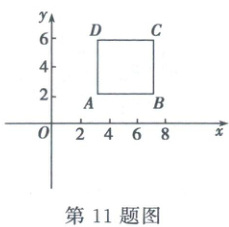 11. 如图,将边长为 4 的正方形置于平面直角坐标系中。若点 $A$ 的坐标为 $(3,2)$,则点 $B$ 的坐标为