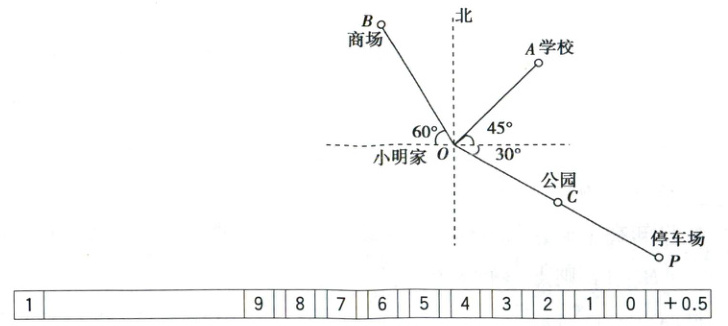 19. (10 分)如图是小明家和学校所在地的简单地图,已知 $OA = 2\ cm$,$OB = 2.5\ cm$,$OP = 4\ cm$,$C$ 为 $OP$ 的中点,回答下列问题: