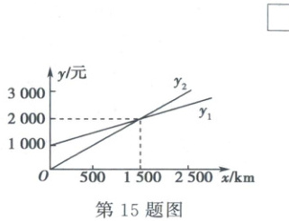 15. 某单位急需用车,但又不准备买车,他们准备和某个体车主或某出租车公司签订月租车合同。设汽车每月行驶 $ x \mathrm { k m } $,应付给个体车主的月费用是 $ y _ { 1 } $ 元,应付给出租车公司的月费用是 $ y _ { 2 } $ 元,$ y _ { 1 } $,$ y _ { 2 } $ 与 $ x $ 之间的函数关系图象(两条射线)分别如图所示。当每月行驶的路程为 ______ $ \mathrm { k m } $ 时,租两家的费用相同。