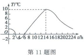 11. 如图是某市某天的气温 $ T ( ^ { \circ } \mathrm { C } ) $ 随时间 $ t ( \mathrm { h } ) $ 变化的图象,则由图象可知,该天最高气温与最低气温之差为