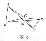 (3)如图3, 当 $ \triangle OCD $ 绕点 $ O $ 旋转任意角度时, $ \angle AMD $ 与 $ \alpha $ 是否存在着某种确定的数量关系? 若存在, 请你用 $ \alpha $ 表示 $ \angle AMD $, 并用图3进行说明; 若不存在, 请说明理由。