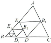 15. (4分)如图, 将$△ABC沿着过BC的中点D$的直线折叠, 使点$B落在边AC上的B_1$处, 称为第一次操作, 折痕$DE到AC的距离记为h_1$; 还原纸片后, 再将$△BDE沿着过BD的中点D_1$的直线折叠, 使点$B落在边DE上的B_2$处, 称为第二次操作, 折痕$D_1E_1到AC的距离记为h_2$; 按上述方法不断操作下去……经过第$n次操作后得到折痕D_{n - 1}E_{n - 1}$, 到$AC的距离记为h_n$。若$h_1 = 1$, 则$h_n$的值为 (