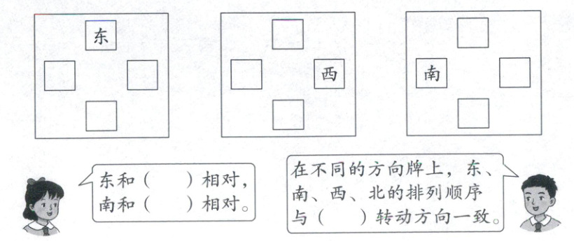 根据方向牌给出的方向填出其他的三个方向,你发现了什么?(共24★)