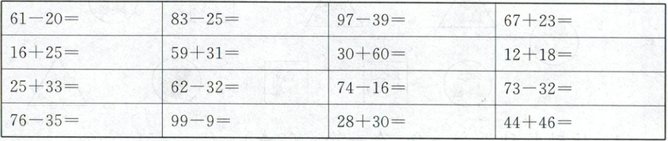 |数量|$2$($12 + 18$,$62 - 32$)|$4$($61 - 20$,$16 + 25$,$73 - 32$,$76 - 35$)|$5$($83 - 25$,$97 - 39$,$25 + 33$,$74 - 16$,$28 + 30$)|$5$($67 + 23$,$59 + 31$,$30 + 60$,$99 - 9$,$44 + 46$)|