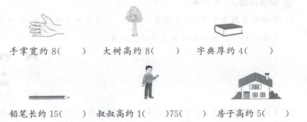 2. 仔细观察,结合生活实际,在( )里填上“米”或“厘米”。