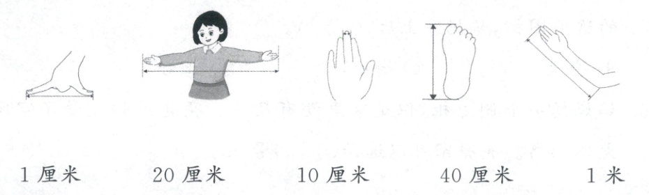 脚印-40厘米,两臂平伸-1米,手掌-10厘米,脚-20厘米,指甲-1厘米(注:因无法直接连线,以文字对应表示,实际答题需按插图正确连线)