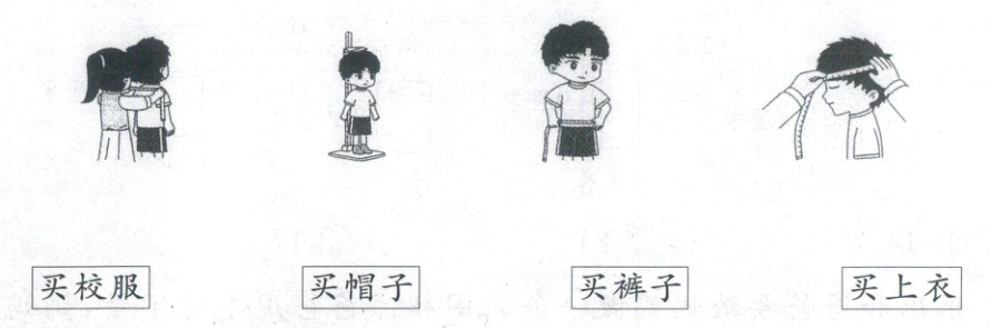 (连线方式:第一个图连买上衣,第二个图连买校服,第三个图连买裤子,第四个图连买帽子)