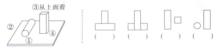 3. 下面左边桌上有一个圆柱和一个长方体,右边四幅图分别是从哪个方向看到的?把相应的序号填在括号里。