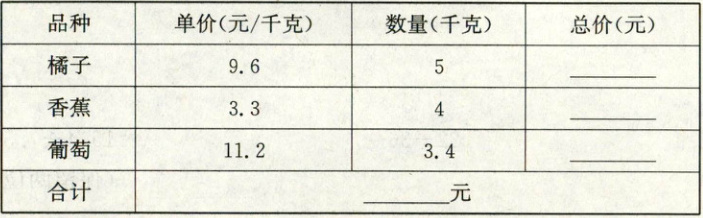 1. 小华帮妈妈准备周末家庭聚餐的用品,他们采购了一部分水果,购物小票信息如下,请你帮忙把表格补充完整,并判断:妈妈带了100元钱,够吗?