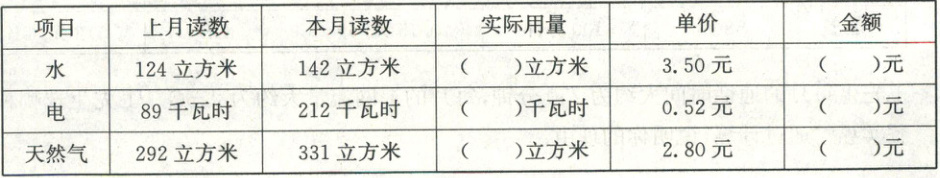 7. 下表是王奶奶家的水、电、天然气的使用情况,把表格补充完整。