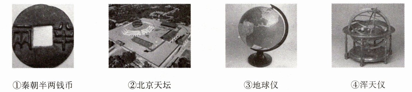 ①秦朝半两钱币 ②北京天坛 ③地球仪 ④浑天仪