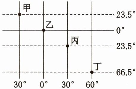 在地球仪上,经线和纬线相互交织,形成经纬网。我们可以利用经纬网确定地球表面任何一个地点的位置。下图为甲、乙、丙、丁四点的位置示意图。据此完成5~7题。