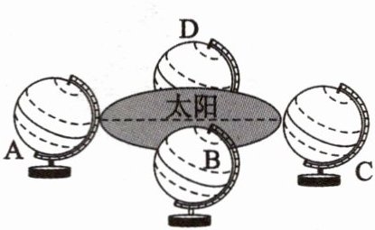 (2)随着地球仪的移动,太阳直射点不断发生变化。当地球移动到图中 A 位置时,北半球处于什么节气?此时,太阳直射哪条纬线?