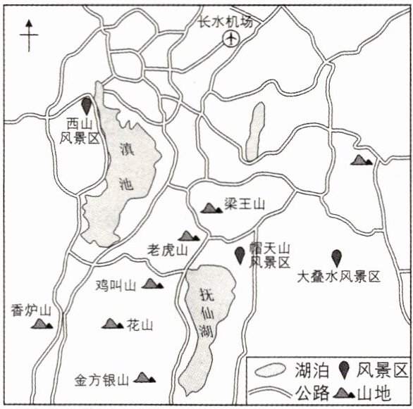 1984年中国古生物学者侯先光在云南省帽天山发现海洋生物化石。读帽天山及周边区域示意图,完成1、2题。
