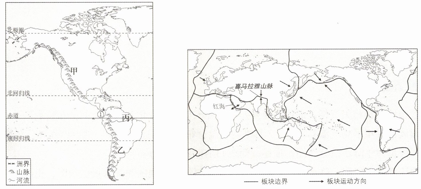 (1)甲:北美洲。乙:南美洲。 分界线①:巴拿马运河。(2)科迪勒拉山系。(3)自西向东流。(4)太平洋板块与美洲板块碰撞挤压,地壳抬升,形成甲山脉。