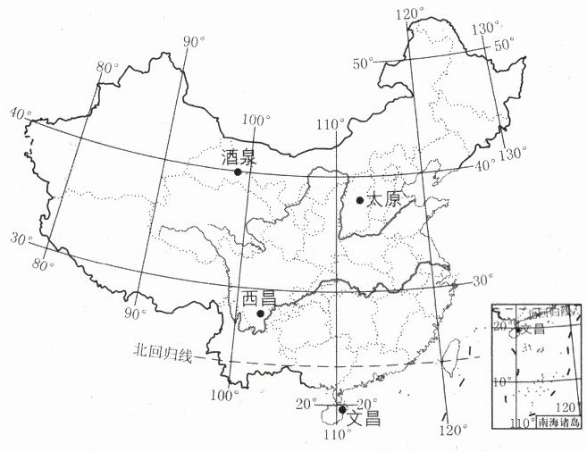 (1)说出太原卫星发射中心大致的经纬度位置,以及西昌与文昌两个卫星发射中心的相对位置。(6分)