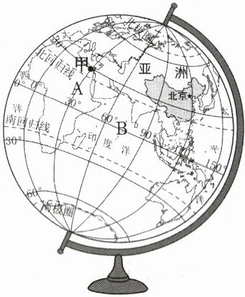 (1)A线是经线,因为其是连接南北两极的半圆弧线;B线是纬线,因为其与经线垂直,是环绕地球一周的圆圈。(8分)(2)甲地的经纬度位置为30°E,30°N。(4分)(3)地轴。 指向北极星附近。(6分)(4)昼夜更替现象、时差等。(6分)