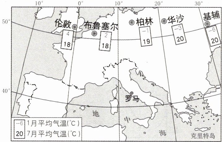 海陆位置对气候特征的影响很明显。下图为欧洲西部几个城市分布示意图,它们纬度相差较小,但7月平均气温和1月平均气温却出现了规律性的变化。据此完成7~9题。