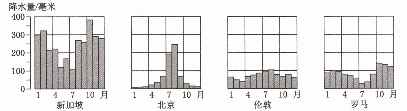 降水的时间变化与空间分布规律,常用降水量柱状图和等降水量线来表示。下图示意北半球四地多年平均各月降水量。据此完成 $4 \sim 6$ 题。