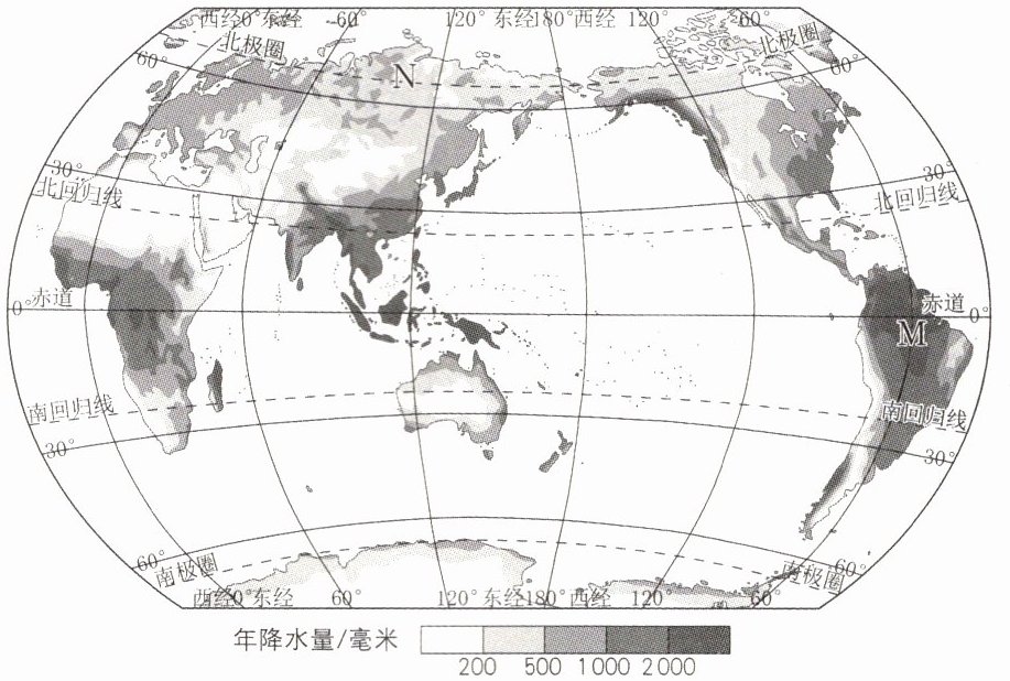 读世界年降水量分布图,完成 $7 \sim 9$ 题。