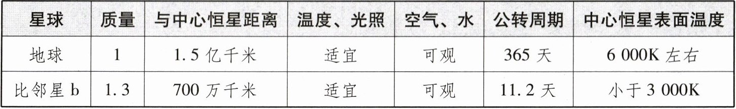 在距离地球约4.2光年的某恒星(比邻星)的宜居带内运行的一颗行星(比邻星b)可能拥有广阔的海洋,这增加了其支持生命存在的可能性。下面是地球与比邻星b相关信息比较表。据此完成4~6题。